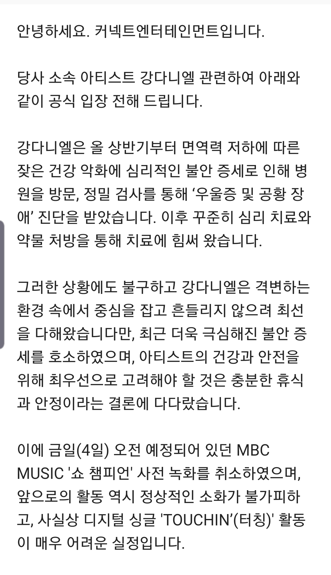 강다니엘씨의 건강 문제로 인하여, 새로운 싱글 터칭의 활동까지도 모두 중단하게 되었다고 합니다.